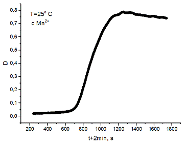 Поэтому, регистрируя зависимость оптической плотности раствора от времени, получаем кинетическую кривую накопления MnO2 в результате автокаталитической реакции.