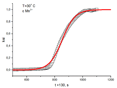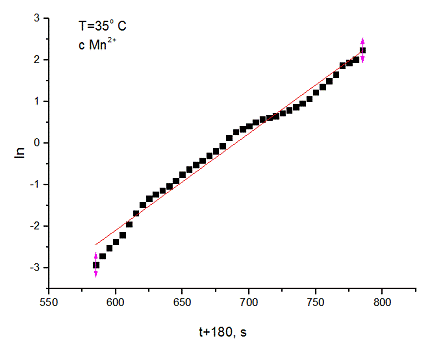В отсутствие начальной затравки Mn2+ реакция протекает со значительным временем индукции, это обусловлено протеканием медленной некаталитической реакции окисления щавелевой кислоты с образованием Mn2+. При использовании исходной затравки Mn2+ время индукции существенно уменьшается.