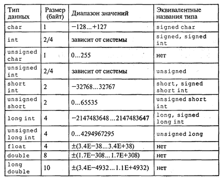 Як відомо, тип величини пов'язаний з її формою внутрішнього представлення, безліччю значень, що набувають, і безліччю операцій, застосованих до цієї величини. У таблиці. 1 перераховані арифметичні типи цих Сі++, вказаний об'єм займаної пам'яті і діапазон допустимих значень.