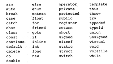 Додаткові до цього списку службові слова приведені в описах конкретних реалізацій Сі++. Деякі з них розпочинаються з символу підкреслення, наприклад: ^export, _ds, _AH та ін. Існують службові слова, що розпочинаються з подвійного підкреслення. У зв'язку з цим програмістові не рекомендується використовувати у своїй програмі ідентифікатори, що розпочинаються з одного або двох підкреслень, щоб уникнути збігу із службовими словами.