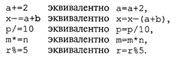 а) х+=2; б) х/=10; в) х*=(х+1); г) х+=х+=х+=1.