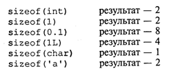 Результатом операції є ціле число, рівне кількості байтів, яка займає в пам'яті величина явно вказаного типу або величина, отримана в результаті обчислення вираження. Остання визначається також за типом результату вираження. Хоча за формою запису це схоже на функцію, проте sizeof є саме операцією. Її пріоритет вищий, ніж у бінарних арифметичних операцій, логічних операцій і стосунків. Приклади використання операції :
