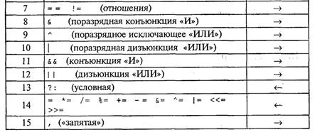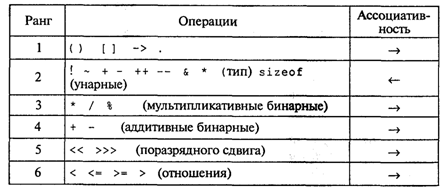 Підведемо підсумок усій розмові про операції Сі/Сі++, звівши їх в загальну таблицю. 2 і розташувавши по рангах. Ранг операції — це порядковий номер у ряді пріоритетів. Чим більше ранг, тим нижче пріоритет. У таблиці відбита ще одно властивість операцій — асоціативність. Якщо одна і та ж операція, що повторюється у вираженні кілька разів, виконується в порядку розташування зліва направо, то вона називається левоассоциативной; якщо виконується справа наліво, то операція правоассоциативная. У таблиці ці властивості відображені стрілками вліво і управо. Деякі операції, присутні в таблиці, поки не обговорювалися.