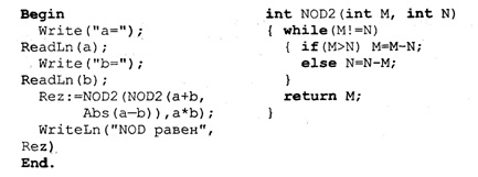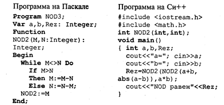 А тепер зіставимо програму на Паскале для обчислення найбільшого загального дільника для суми, різниці і твору двох чисел з аналогічною програмою на Сі++.