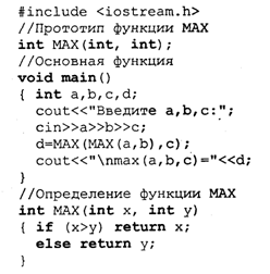 Виявляється, зовсім не обов'язково було в попередньому прикладі поміщати повне визначення функції МАХ() перед основною частиною програми. Ось інший варіант програми, що вирішує ту ж саму задачу.