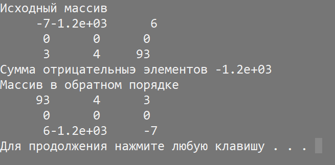 Рисунок 5.3 – Вывод исходного массива, подсчет суммы отрицательных элементов и вывод массива в обратном порядке