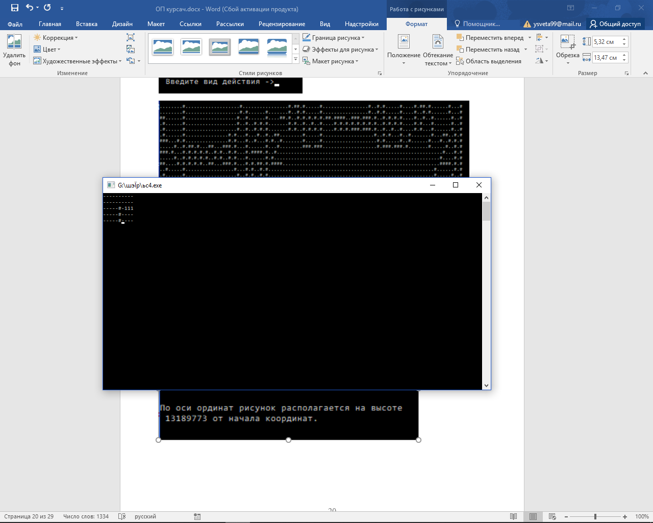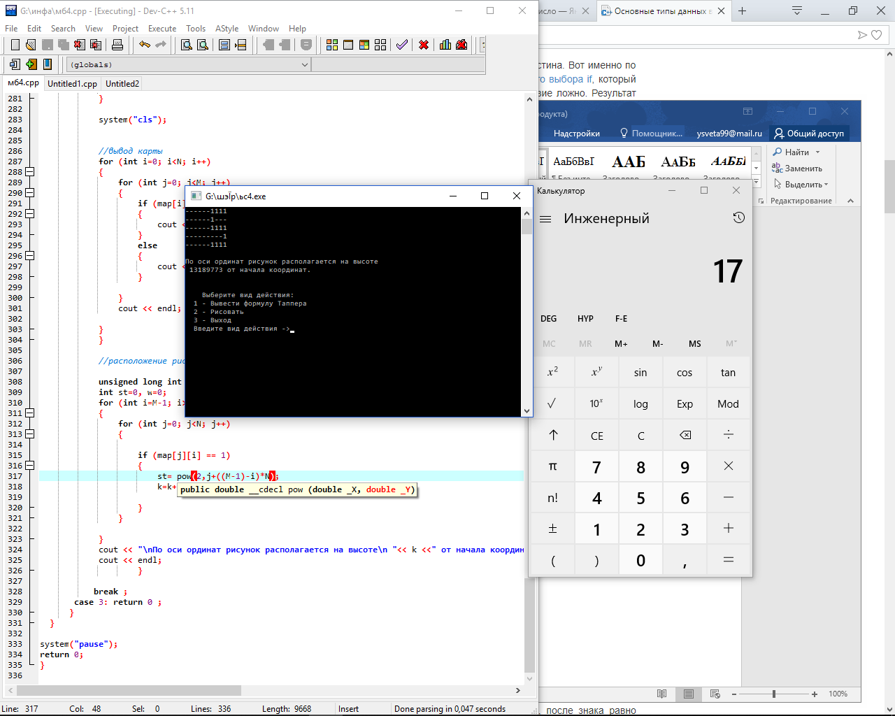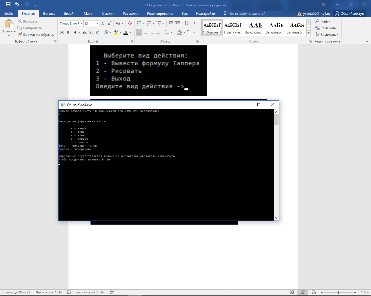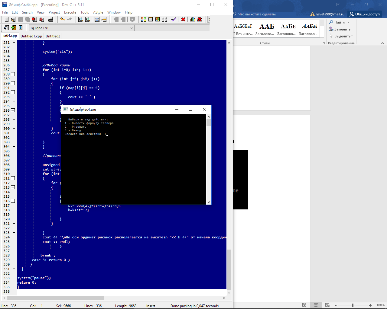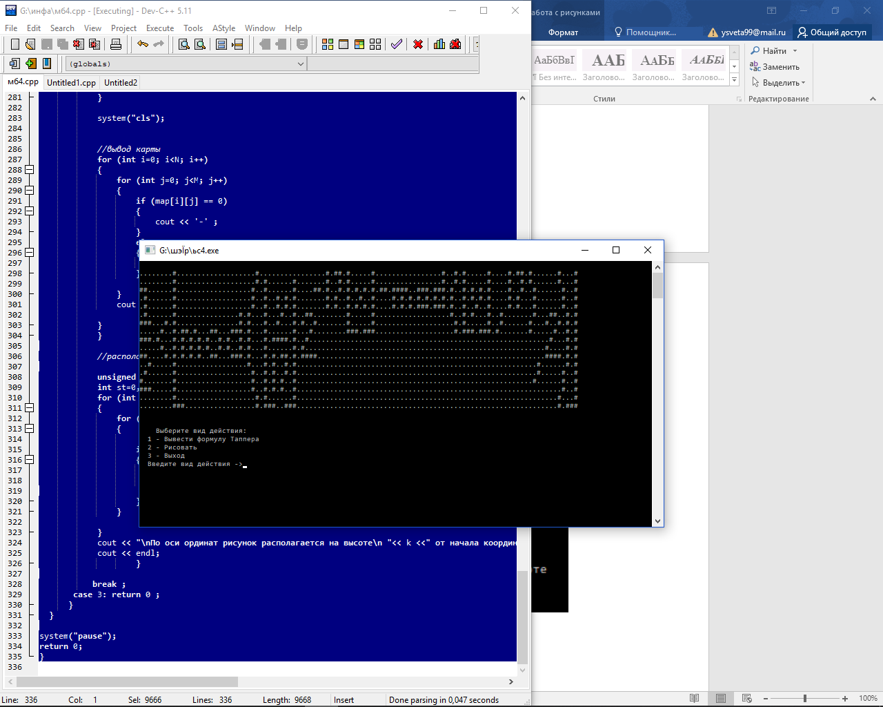 Программа, написанна на языке C++. При открытии программы предлагается на выбор два действия. Первое – выводит на экран поле размером 106х17 с формулой. Второе – позволяет самому нарисовать рисунок, управление осуществляется с помощью клавиатуры, а затем выводится координата показывающая расположение рисунка на оси ординат.