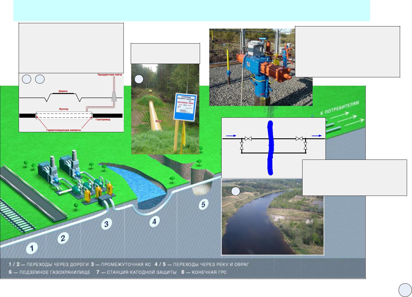 Линейная часть газопровода состоит из: газопровода; крановых узлов (запорная и регулирующая арматура); узлов приема и запуска внутритрубных устройств; перемычек между газопроводами; переходов газопровода через естественные и искусственные преграды; вертолетных площадок; средства электрохимической защиты (ЭХЗ); средств связи и телемеханики; оборудования энергоснабжения.