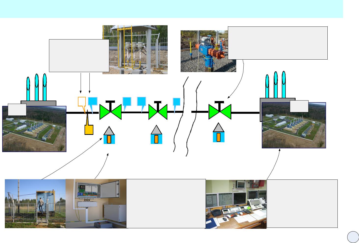 Системы телемеханики, устанавливаемые на линейной части магистрального газопровода обеспечивают автоматический дистанционный контроль технологического процесса транспорта (перекачки) газа между компрессорными станциями, позволяет в любой момент времени менять данный режим дистанционно по команде диспетчера, управляя кранами на газопроводе. Кроме того, одной из основных функций данных систем является оперативная локализация нештатных ситуаций на газопроводах.