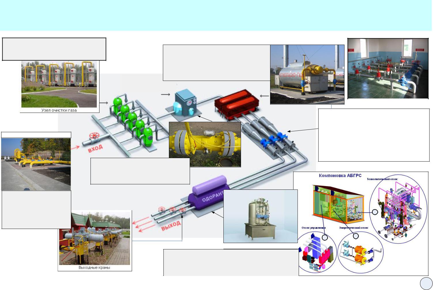 Газораспределительные станции (ГРС) предназначены для понижения давления газа, подаваемого из магистральных газопроводов потребителям, очистки его от механических частиц и конденсата, одоризации и измерения расхода. Основными объектами ГРС являются: узлы переключения станции, очистки газа, предотвращения гидратов, регулирования давления, учета и одоризации газа. ГРС небольших мощностей (1,2,3,5,10,20 и иногда более тыс.м.куб/час) поставляются в блочно-модульных конструкциях контейнерного типа, где все системы размещены в одном или нескольких контейнерах заводского исполнения, которые могут транспортироваться на обычных транспортных средствах, значительно сокращают время и стоимость строительства и упрощают эксплуатацию систем газораспределения в целом.
