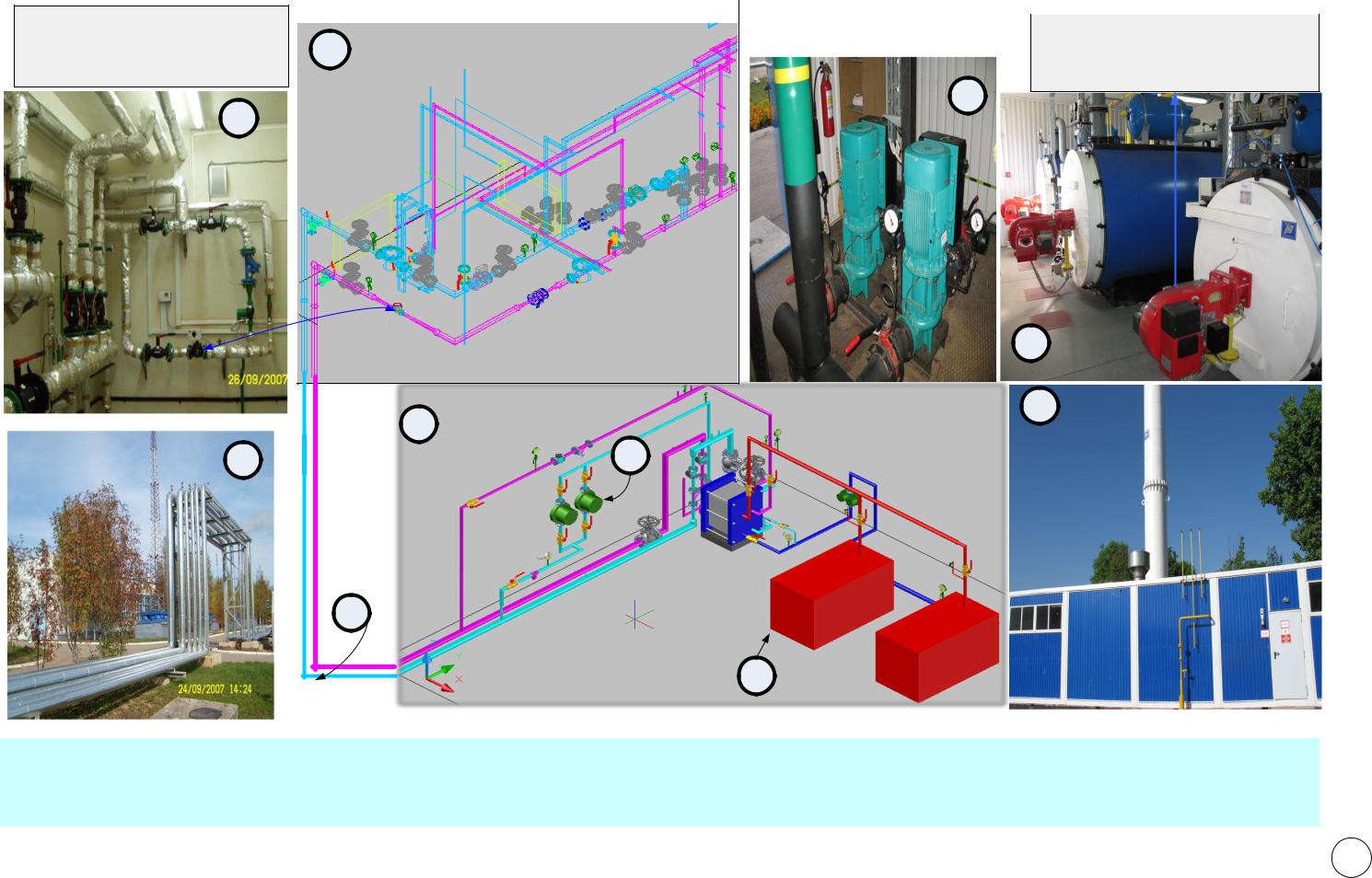 1-Источник теплоснабжения- Блок-модульная автоматизированная газовая котельная с дымовой трубой, для отвода угарных газов 2- Котел водогрейный, жаротрубный для нагрева теплоносителя до температуры 95° С. 3. Группа циркуляционных насосов для обеспечения требуемого давления в системе теплоснабжения. 4- Тепловая сеть -наружная прокладка стального изолированного трубопровода с оцинкованной окожушкой.5- автоматизированный тепловой пункт. Предназначен для контроля и автоматического управления значениями параметров теплоносителя, подаваемого в системы отопления и горячего водоснабжения с целью создания комфортных условий в помещениях.
