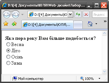 <b>Яка пора року Вам більше подобається? </b> <input type=radio name=answer value=a1>Весну <input type=radio name=answer value=a2>Лето <input type=radio name=answer value=a3>Осень <input type=radio name=answer value=a4>Зиму </form>