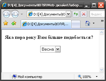 <form action="/cgi-bin/handler.cgi"> <b>Яка пора року Вам більше подобається?</b> <p align=center> <select name= пора року> <option>Весну</option> <option>Лето</option> <option>Осень</option> <option>Зиму</option> </select> </form>
