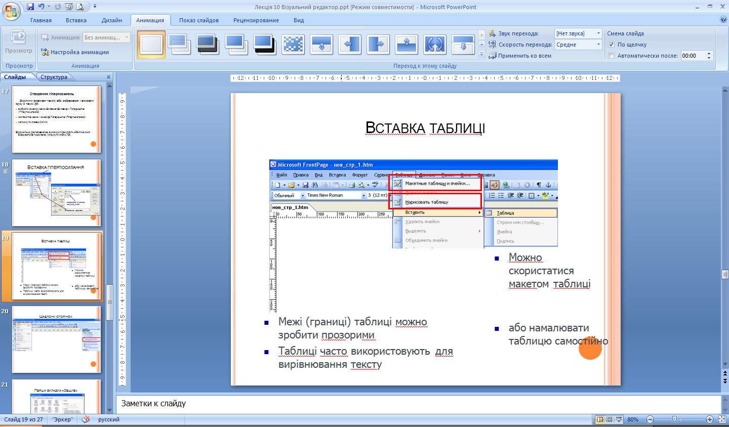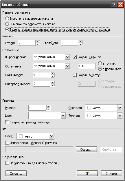 Вставка таблицы (Вставлення таблиці) (рис. 5), в якому можна визначити всі параметри таблиці.