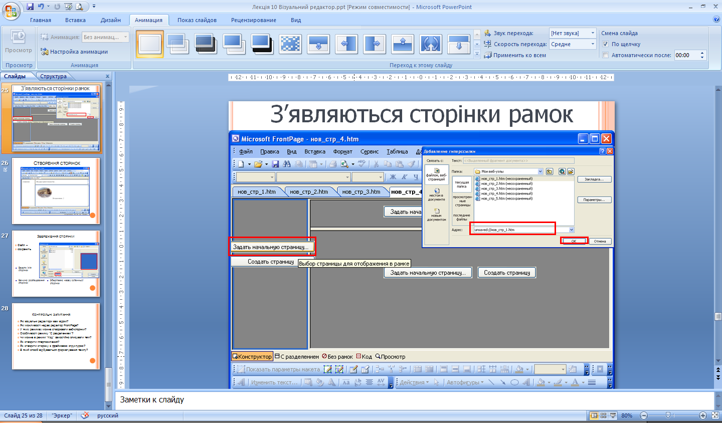 Після клацання кнопки ОК сторінка з фреймами буде відкрита у вікні програми FrontPage (рис. 11). Подальші дії полягають у тому, щоб відповідним чином заповнити отриману структуру за допомогою засобів програми FrontPage: відобразити у фреймах уже наявні веб-сторінки, скориставшись кнопкою Задать начальную страницу (Задати початкову сторінку), або створити нові — кнопкою Создать страницу (Створити сторінку).