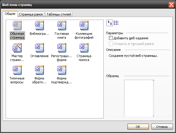 Праворуч у вікні розташовано опис вибраного шаблону та його схематичний вигляд. Вигляд списку шаблонів можна змінювати за допомогою кнопок, що містяться праворуч вгорі. Якщо відкрита сторінка з фреймами (див. далі) і потрібно, щоб новий документ відкрився у поточному фреймі, то слід встановити прапорець Открыть в текущей рамке (Відкрити у поточному фреймі).