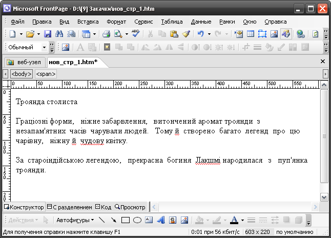 Створіть нову веб-сторінку, клацнувши кнопку Создание новой обычной страницы (Створення нової звичайної сторінки) на панелі інструментів Стандартная (Стандартна).