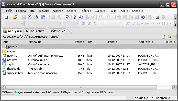Відкривши сайт, FrontPage не відкриває жодного його файлу, а лише показує вміст папки. Конкретний файл можна відкрити, двічі клацнувши його назву. Який вигляд має вікно програми FrontPage з відкритим сайтом показано на рис. 2. Якщо папку зі сторінками сайту в програмі FrontPage ще не відкривали, то з'явиться діалогове вікно із запитом, чи можна додати необхідні технічні каталоги для керування цим сайтом. Після позитивної відповіді така папка стане веб-сайтом у середовищі програми FrontPage. Якщо ж у такий спосіб відкрити порожню папку, то це означатиме створення нового сайту. Значки, якими позначені веб-сайти, схожі на значки папок, на яких розміщене зображення глобуса.