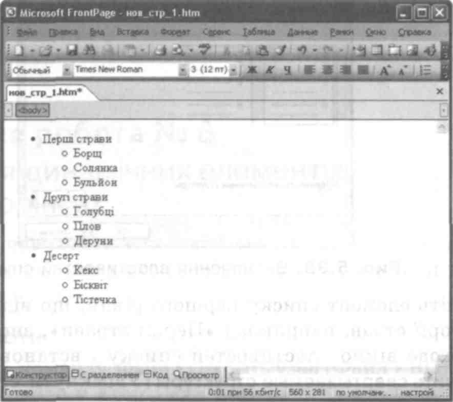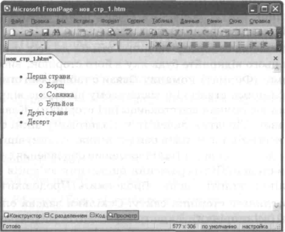 Перейдіть в режим попереднього перегляду сторінки, вибравши вкладку Просмотр (Перегляд) у нижній частині робочої області. На екрані відображатимуться лише елементи верхнього рівня дворівневого списку, тобто назви категорій страв. Після клацання мишею кожної з них список розкриється, показуючи елементи другого рівня обраної категорії, тобто самі страви (рис. 17). Після повторного клацання список згортається.