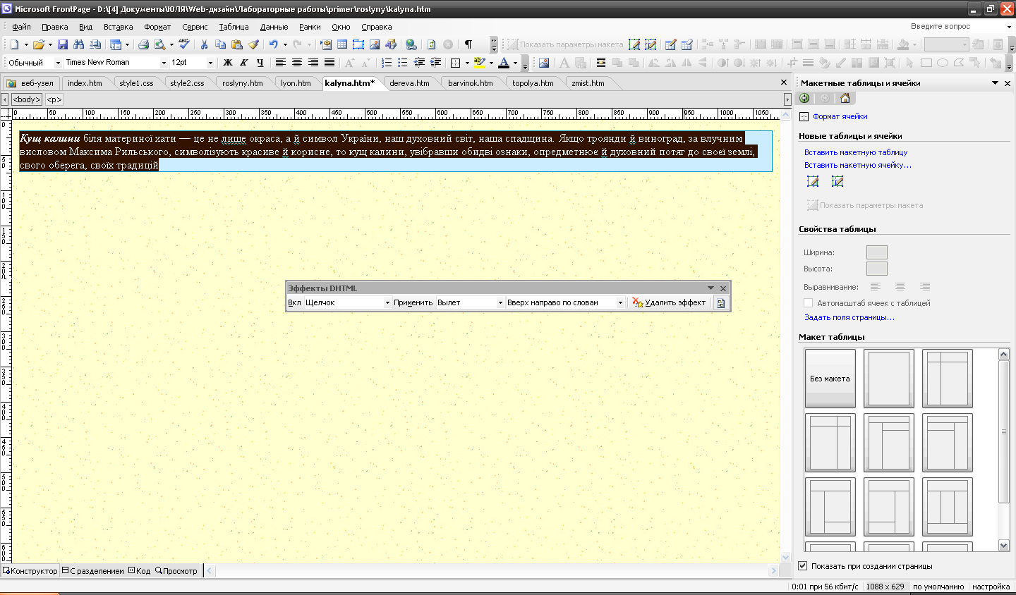 Відкрити одну зі сторінок будь-якого сайту (наприклад, створеного раніше на практичних заняттях), і виділити текст, для якого застосувати ефект анімації «Влітання».