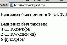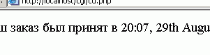 У цьому коді убудована PHP-функція date() використовується для повідомлення клієнтові дати й часу обробки замовлення. Це значення буде змінюватися при кожнім виконанні сценарію. Вивід, отриманий у результаті одного такого виконання сценарію показаний на рисунку 3.