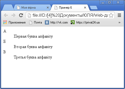 <DL| COMPACT|> <DT>А| <DD>Первая| буква алфавіту <DT>Б| <DD>Вторая| буква алфавіту <DT>В| <DD>Третья| буква алфавіту </DL> |