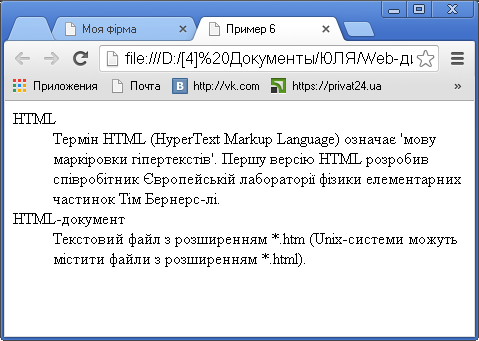 Список визначень декілька відрізняється від інших видів списків. Замість міток <LI|> в списках визначень використовуються мітки <DT|> (від англійського definition| term| — визначуваний термін) і <DD|> (від англійського definition| definition| — визначення визначення). Розберемо це на прикладі. Нехай, у нас є наступний фрагмент HTML-текста|: