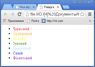 Зверніть увагу на те, що за допомогою тегу < B A S E F O N T > для всього документа призначено розмір шрифту 6, а за допомогою тегів <FONT> визначено колір шрифту для кожного елемента списку.
