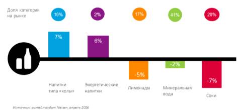 Согласно исследованию Nielsen, проведенному в 2016 году, рост продаж в сегменте безалкогольных напитков наблюдается только в категориях энергетических напитков и напитков типа «колы», тогда как продажи остальных товаров категории либо остаются на том же уровне, либо падают. Продажи напитков типа «колы» возросли на 7%, а продажи энергетиков - на 6%. Из рис. 7 видно, что данные продукты занимают далеко не большую долю рынка - всего 2% для энергетических напитков и 10% для напитков типа «колы».