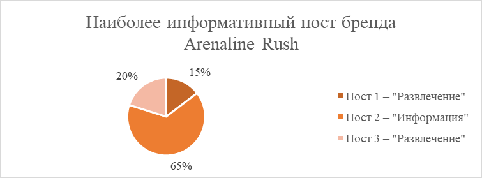 Таким образом, для бренда Adrenaline Rush наиболее информативным среди постов, набравших наибольшее количество «лайков» за анализируемый период, стал пост типа контента «Информация», в котором бренд освещает новый мировой рекорд велотриалиста (экстремальный вид спорта).