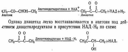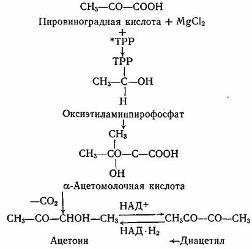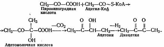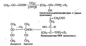 Рассматривая схемы биосинтеза ацетоина и диацетила можно считать, что наиболее правдоподобной является схема конденсации оксиэтилтиаминпирофосфата со свободным уксусным альдегидом с образованием энзимацетоин-ТРР-комплекса и распадом этого комплекса в ацетоин. Эта схема имеет место при алкогольном брожении, когда образуется значительное количество уксусного альдегида при декарбоксилировании пировиноградной кислоты.