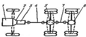 1 - двигатель, 2 - сцепление, 3 - коробка передач, 4,7 - карданные