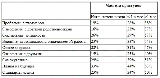 Больные эпилепсией отмечающие отсутствие эпилептологических приступов в течение года имеют проблемы с партнером в 19%случаев,проблемы в семье 16%,проблемы в отношениях с друзьями 15%,в социальной жизни 26%,влияние на возможность оплачиваемой работы 23%,влияние болезни на общие здоровье 22%,на самочувствие 29%,проблемой в формировании планов на будущее имеют 33%,23% считаю что эпилепсия нарушает стандарты жизни.