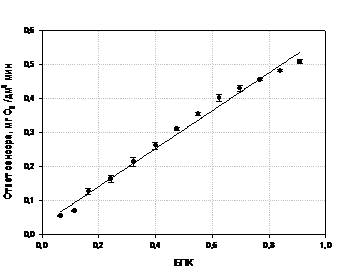 Для калибровочных зависимостей гиперболического вида линейный диапазон ограничен снизу нижней границей определяемых содержаний, сверху - концентрацией, равной КМ. Так для биосенсора на основе дрожжей Debaryamyces hansenii линейный диапазон зависимости ответа биосенсора от концентрации ГГС составил 0,23 - 44 мг/дм3. Учитывая, что теоретическая зависимость БПК от концентрации ГГС имеет вид: БПК = 0,687×С, линейный диапазон зависимости ответа биосенсора от БПК составил 0,16 - 30 мг/дм. Для биосенсора на основе дрожжевого штамма Debaryamyces hansenii иммобилизированного в модифицированный ПВС линейный диапазон зависимости ответа биосенсора от БПК (ОЕСD-синтетических сточных вод) составил 0,05 -1,21мг/дм3 .