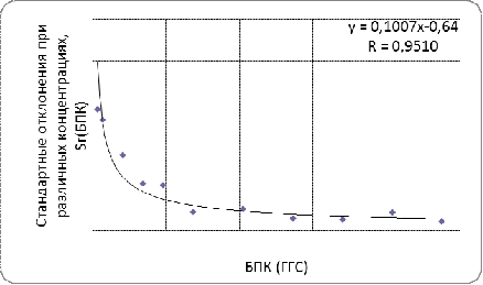 аппроксимации зависимости относительного стандартного отклонения от БПК(ГГС)