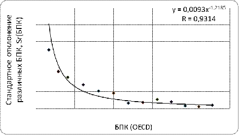 аппроксимации зависимости относительного стандартного отклонения от БПК (ОЕСD)