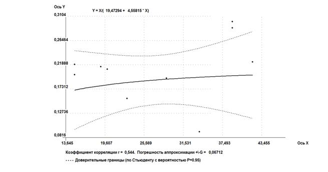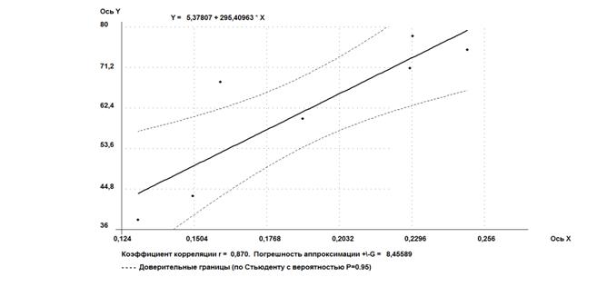 Коэффициент корреляции(R, r) - параметр, характеризующий степень линейной взаимосвязи между двумя выборками. Коэффициент корреляции изменяется от - 1 (строгая обратная линейная зависимость) до 1 (строгая прямая пропорциональная зависимость). При значении 0 линейной зависимости между двумя выборками нет. Здесь под прямой зависимостью понимают зависимость, при которой увеличение или уменьшение значения одного признака ведет, соответственно, к увеличению или уменьшению второго. При обратной зависимости увеличение одного признака приводит к уменьшению второго и наоборот [14]. Таким образом, если коэффициент корреляции равен: