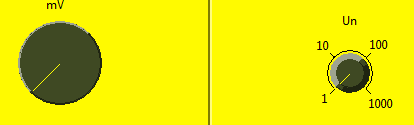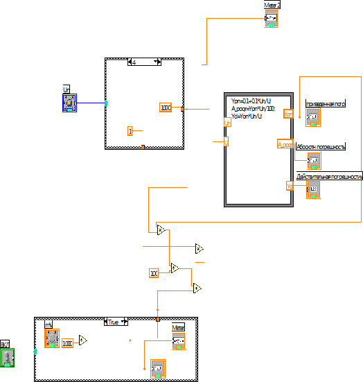В теле узла прописана формула из условия задачи для вычисления приведенной погрешности вольтметра. Для отображения результата вычисления абсолютной, действительной, приведенной погрешностей используется набор индикаторов (Indicator). Для имитации шкалы вольтметра В7-16 используется элемент Meter. Виртуальный прибор позволяет автоматически вычислять оптимальный предел измерения электротехнического параметра.