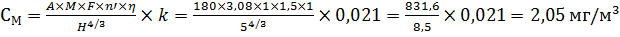 Коэффициент F учитывает скорость оседания загрязняющих веществ в атмосферном воздухе. При отсутсвии данных о фракционном составе выбрасываемых загрязняющих твердых веществ принимаед для газообразных загрязняющих веществ и мелкодисперсных аэрозолей (пыли, золы и т.п., скорость упорядоченного оседания которых практически равна нулю) F=1.