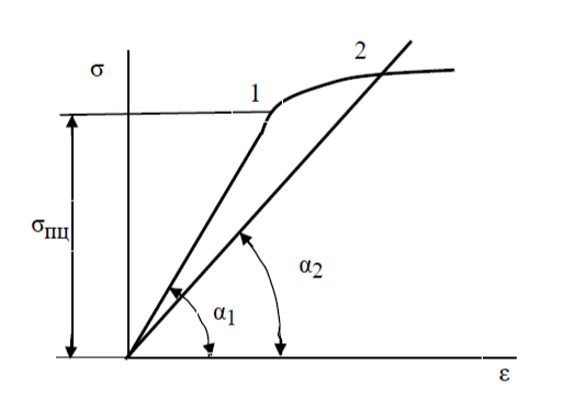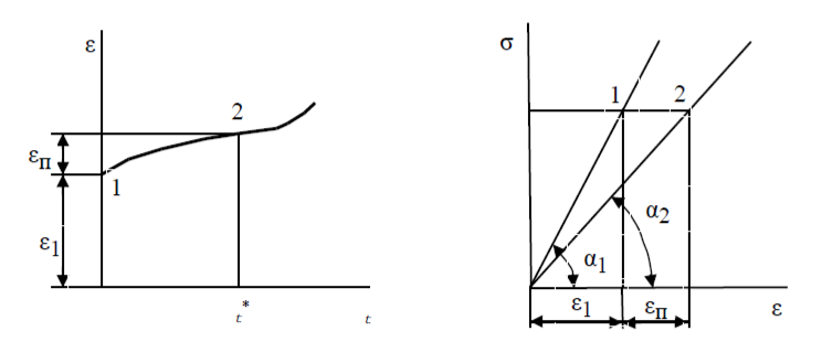 Ползучесть приводит к кажущемуся снижению модулей Е и G (рис. 1 - правый), так как в опыте измеряются напряжение и деформация, соответствующие точке 2, а не точке 1.