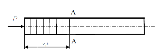 Пусть к торцу стержня внезапно приложена постоянная сжимающая сила (рис. 3). В первый момент сила Р вызовет сжатие бесконечно малого элемента, непосредственно примыкающего к торцу. Это сжатие передается следующему элементу и т. д., причем этот процесс будет постепенно (не мгновенно) развиваться во времени. В момент времени t сжатой будет лишь некоторая часть длины стержня (она заштрихована на рисунке), тогда как остальная часть еще не испытывает сжатия. Обозначим через vl скорость, с которой распространяется деформация сжатия вдоль оси стержня. Тогда vlt есть длина сжатого участка в момент времени t. Сечение А–А, которое служит границей, между напряженной и ненапряженной частями стержня, называется фронтом упругой волны, этот фронт движется со скоростью vl. Распространение волны можно трактовать как движение фронта волны.