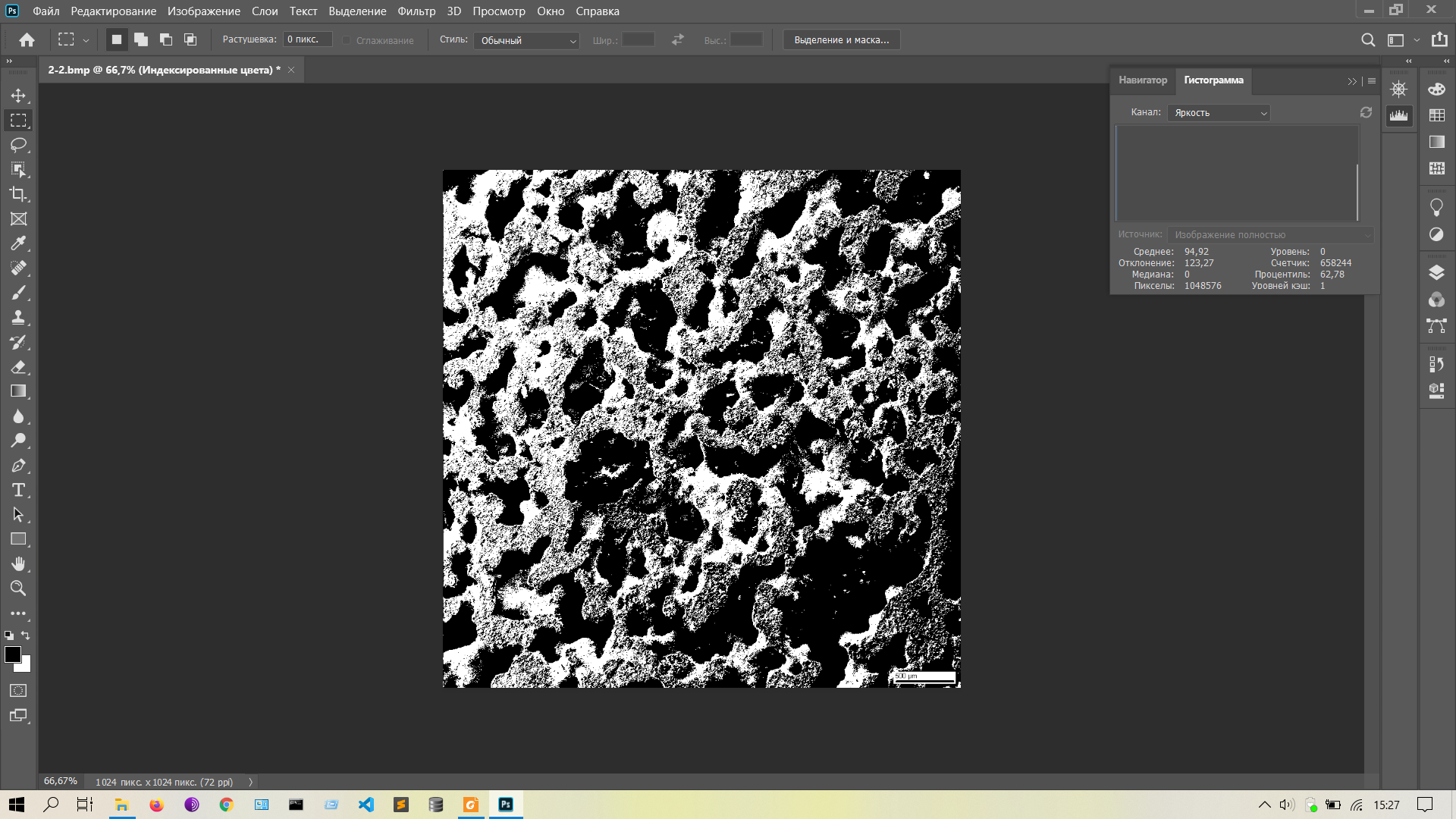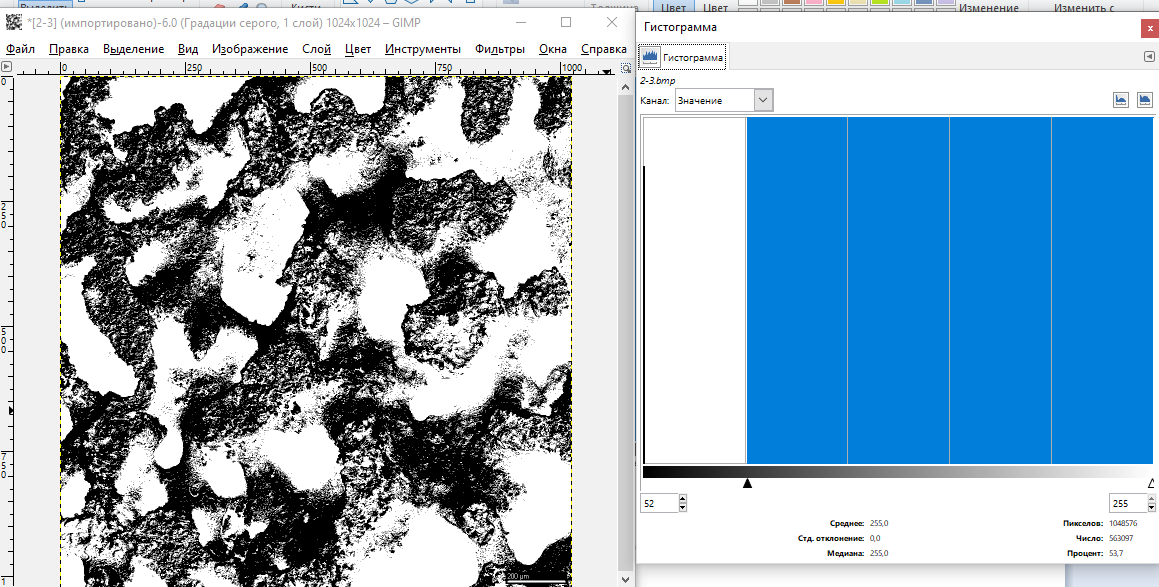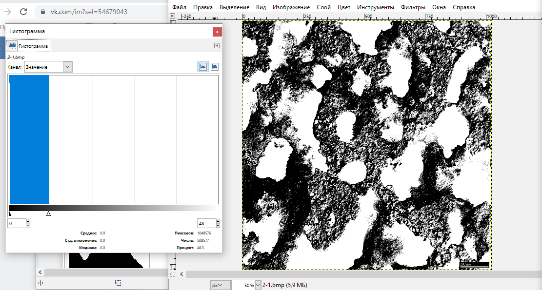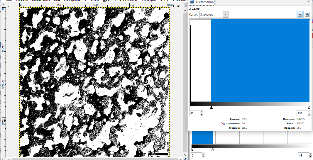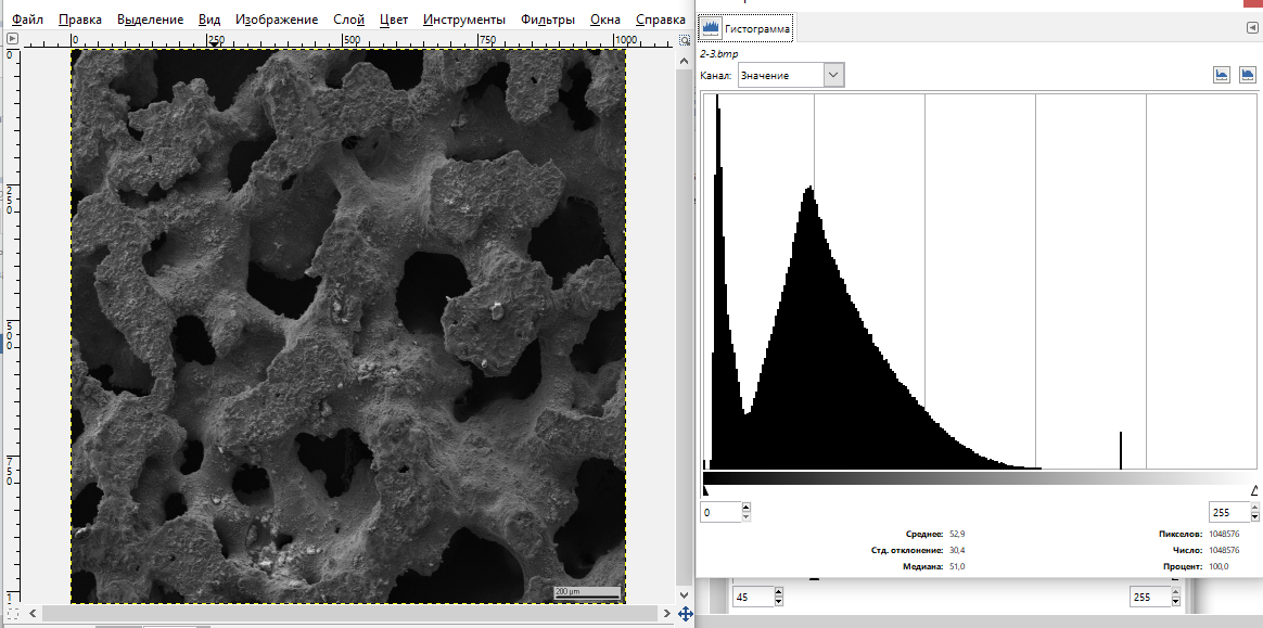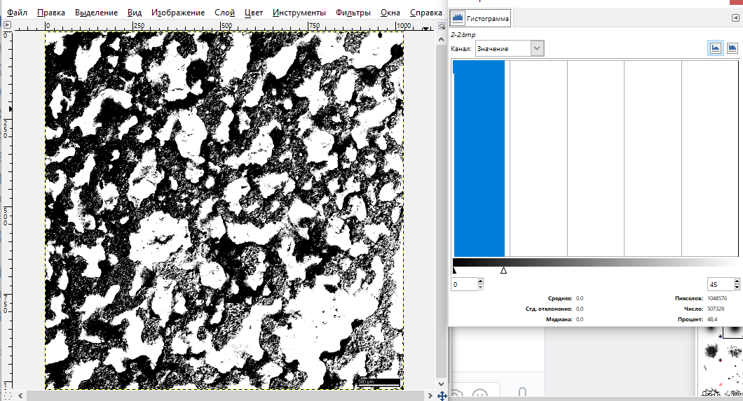 Судить о свойствах никелида титана исходя лишь из косвенных показателей, таких как площадь пор и трещин на снимке, было бы неграмотно. Для оценки пористости материала необходимо также иметь представление об общем строении и структуре материала. Протяженность пор может быть достаточно велика, чтобы делать какие-либо либо заключения по образцам в целом. Однако, приняв некоторые допущения можно судить о пористости поверхностного слоя толщиной всего в несколько микрон. В таком случае глубина трещинок, в сравнении с их протяженностью, окажет незначительное влияние на конечные результаты вычислений. Общая площадь пор образца «2.1 bmp» составляет 53.38% от площади поверхности, на основании полученного соотношения можем судить о неупорядоченной пористой структуре образца «2.1.bmp» никелида титана. Результаты вычислений по образцам «2.2.bmp» и «2.3.bmp» : 62,78% и 58.04% соответственно, что даже выше, чем у первого образца. На основании серии измерений установим среднее значение пористости поверхности никлида титана равным 58.06%. Произведя измерения в нескольких средах обработки изображения : Adobe Photoshop CC 2020 и GIMP , мы получили примерно одинаковые значения, однако, стоит отметить, что точность вычислений зависит от машинной логики, заложенной в обработчике среды, ведь один и тот же функционал реализован по-разному. Нельзя так же не отметить существование нескольких удобных средств внутри самого Adobe Photoshop CC 2020. «Волшебная кисть» и «Лассо» позволяют выделить необходимую область для получения информации о числе черных и белых пикселей, но стоит с осторожностью отнестись к ручным средствам выбора, т.к. значительно снижается точность вычисления.
