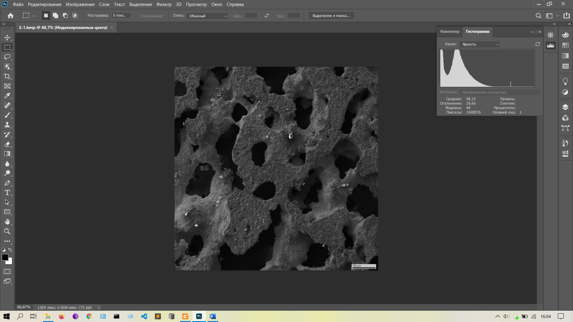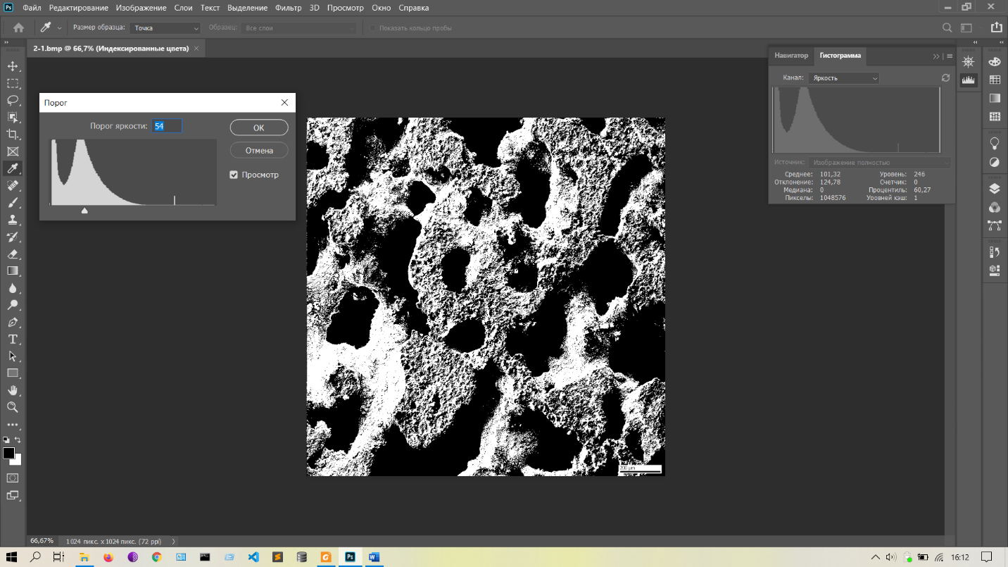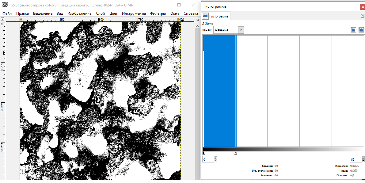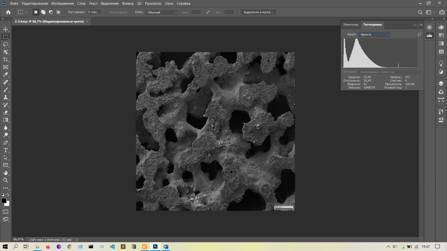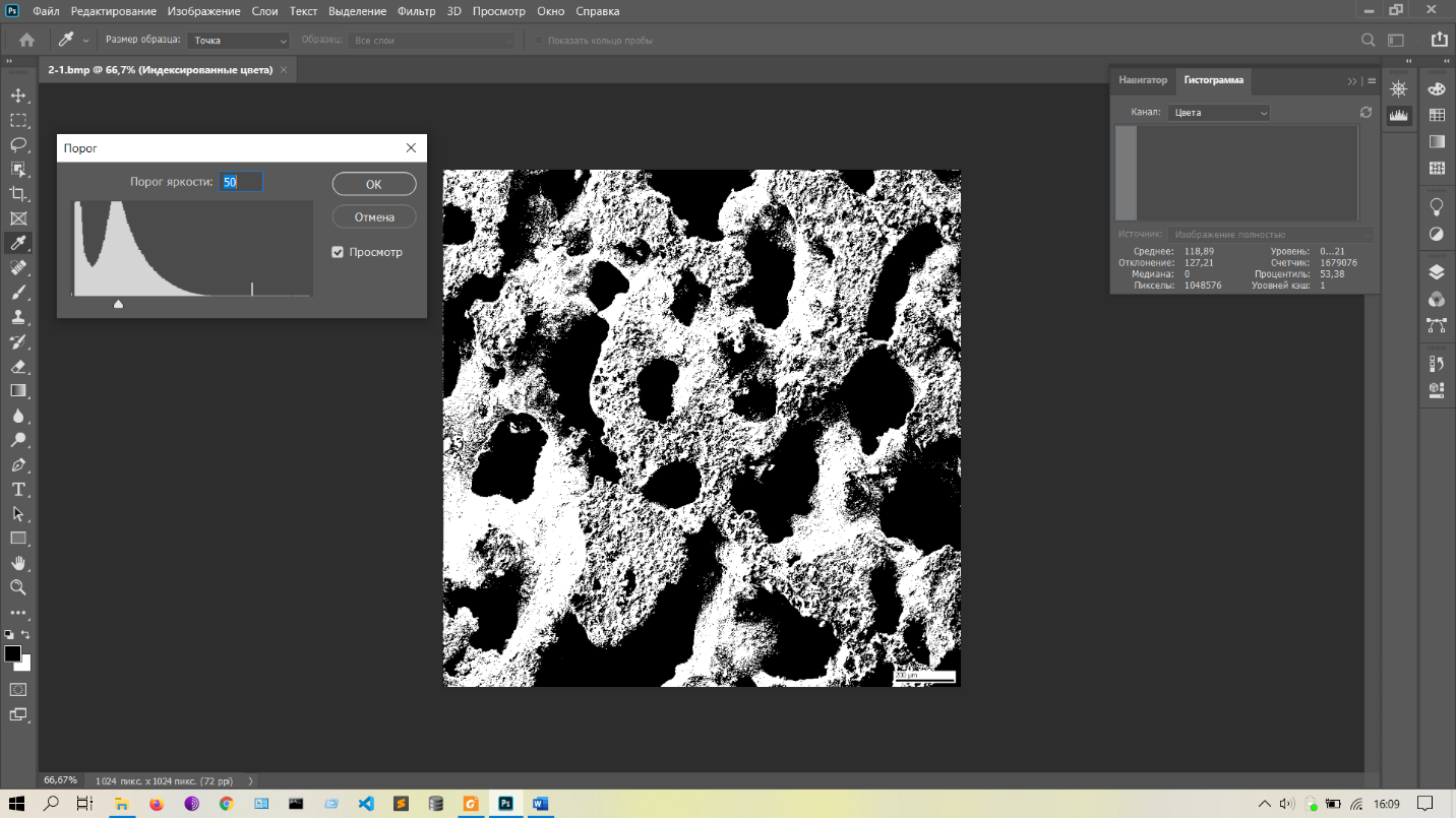 Судить о свойствах никелида титана исходя лишь из косвенных показателей, таких как площадь пор и трещин на снимке, было бы неграмотно. Для оценки пористости материала необходимо также иметь представление об общем строении и структуре материала. Протяженность пор может быть достаточно велика, чтобы делать какие-либо либо заключения по образцам в целом. Однако, приняв некоторые допущения можно судить о пористости поверхностного слоя толщиной всего в несколько микрон. В таком случае глубина трещинок, в сравнении с их протяженностью, окажет незначительное влияние на конечные результаты вычислений. Общая площадь пор образца «2.1 bmp» составляет 53.38% от площади поверхности, на основании полученного соотношения можем судить о неупорядоченной пористой структуре образца «2.1.bmp» никелида титана. Результаты вычислений по образцам «2.2.bmp» и «2.3.bmp» : 62,78% и 58.04% соответственно, что даже выше, чем у первого образца. На основании серии измерений установим среднее значение пористости поверхности никлида титана равным 58.06%. Произведя измерения в нескольких средах обработки изображения : Adobe Photoshop CC 2020 и GIMP , мы получили примерно одинаковые значения, однако, стоит отметить, что точность вычислений зависит от машинной логики, заложенной в обработчике среды, ведь один и тот же функционал реализован по-разному. Нельзя так же не отметить существование нескольких удобных средств внутри самого Adobe Photoshop CC 2020. «Волшебная кисть» и «Лассо» позволяют выделить необходимую область для получения информации о числе черных и белых пикселей, но стоит с осторожностью отнестись к ручным средствам выбора, т.к. значительно снижается точность вычисления.