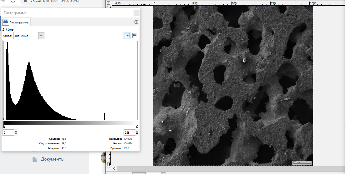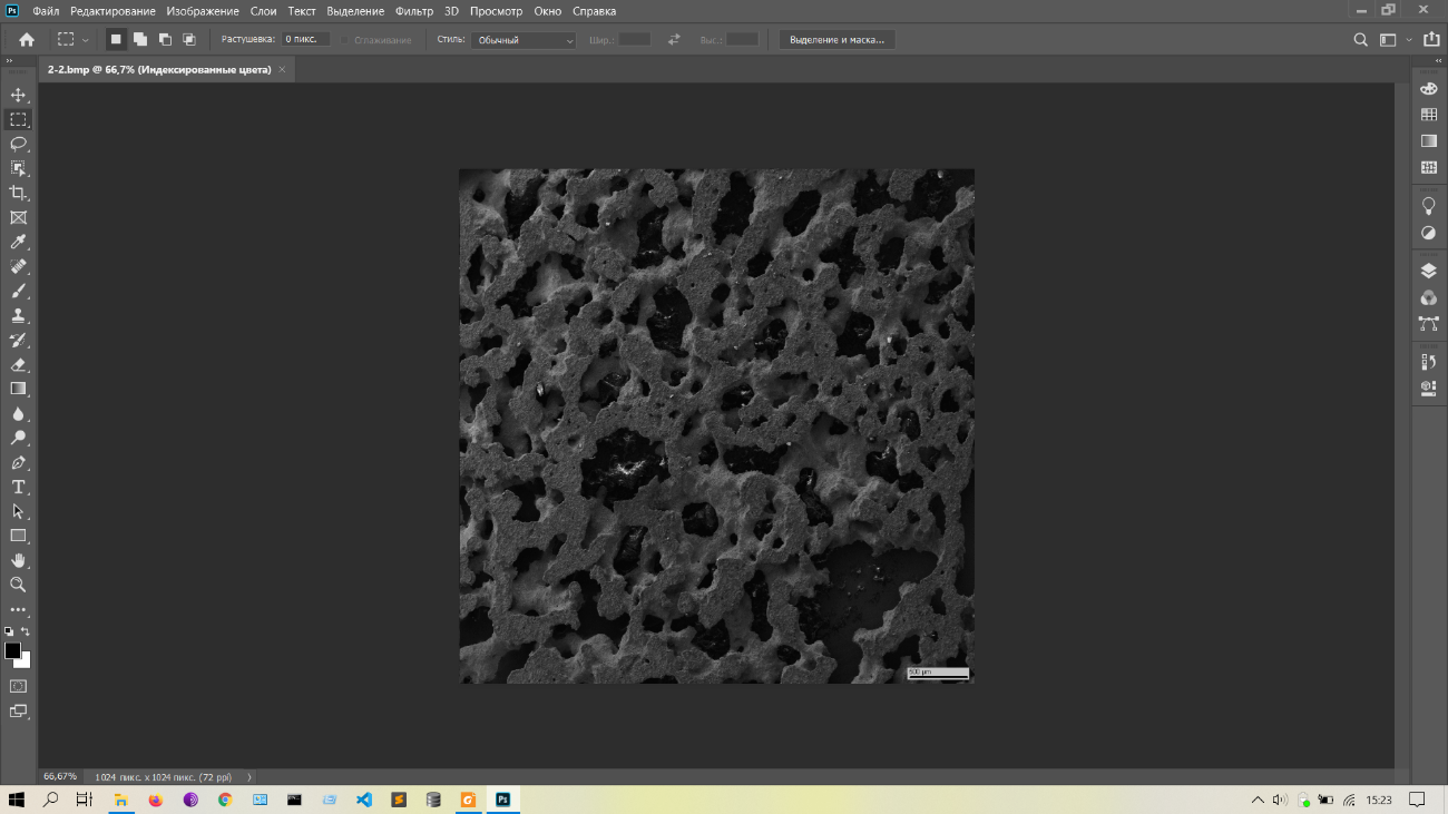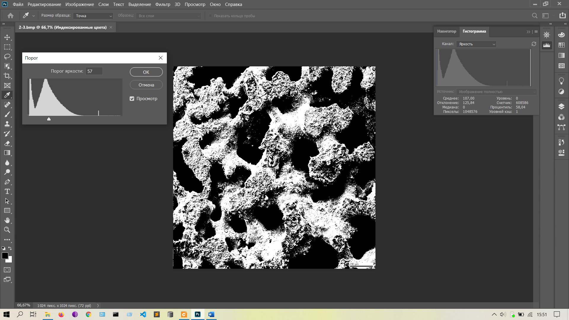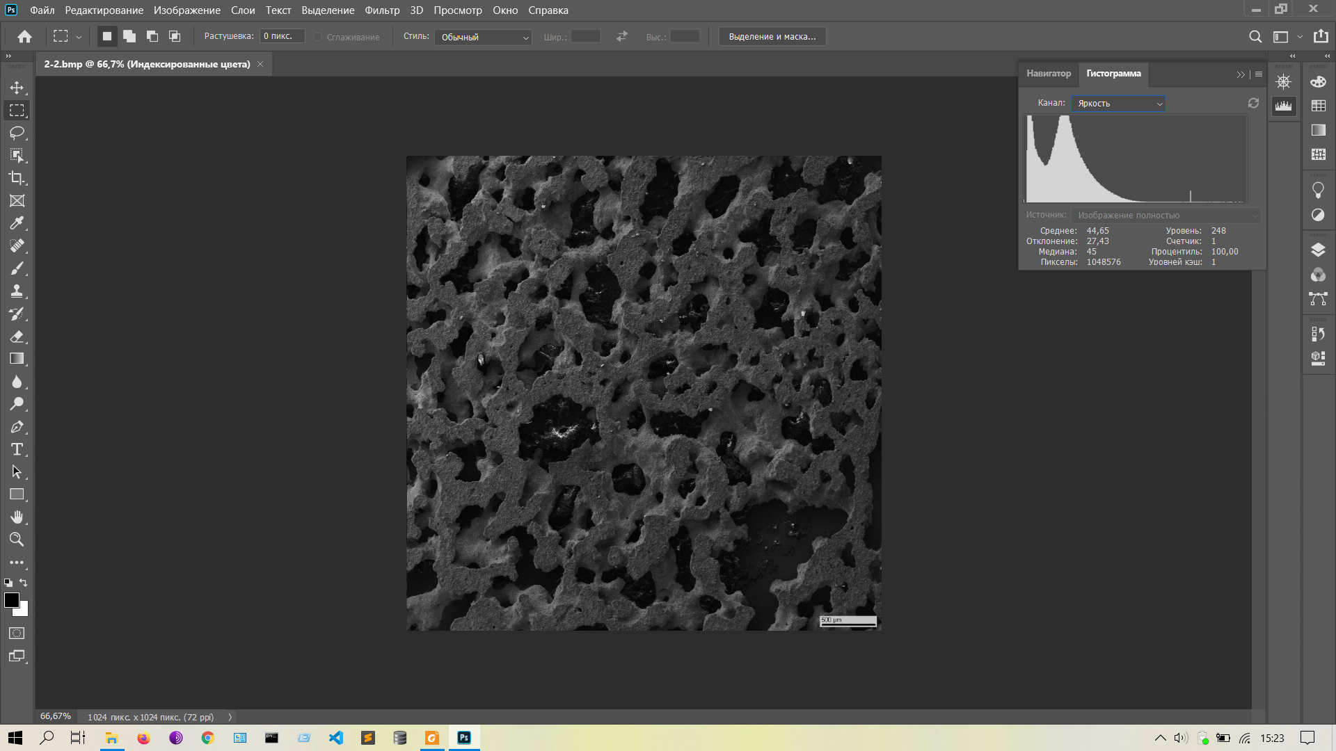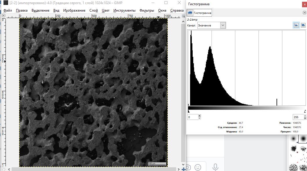 Судить о свойствах никелида титана исходя лишь из косвенных показателей, таких как площадь пор и трещин на снимке, было бы неграмотно. Для оценки пористости материала необходимо также иметь представление об общем строении и структуре материала. Протяженность пор может быть достаточно велика, чтобы делать какие-либо либо заключения по образцам в целом. Однако, приняв некоторые допущения можно судить о пористости поверхностного слоя толщиной всего в несколько микрон. В таком случае глубина трещинок, в сравнении с их протяженностью, окажет незначительное влияние на конечные результаты вычислений. Общая площадь пор образца «2.1 bmp» составляет 53.38% от площади поверхности, на основании полученного соотношения можем судить о неупорядоченной пористой структуре образца «2.1.bmp» никелида титана. Результаты вычислений по образцам «2.2.bmp» и «2.3.bmp» : 62,78% и 58.04% соответственно, что даже выше, чем у первого образца. На основании серии измерений установим среднее значение пористости поверхности никлида титана равным 58.06%. Произведя измерения в нескольких средах обработки изображения : Adobe Photoshop CC 2020 и GIMP , мы получили примерно одинаковые значения, однако, стоит отметить, что точность вычислений зависит от машинной логики, заложенной в обработчике среды, ведь один и тот же функционал реализован по-разному. Нельзя так же не отметить существование нескольких удобных средств внутри самого Adobe Photoshop CC 2020. «Волшебная кисть» и «Лассо» позволяют выделить необходимую область для получения информации о числе черных и белых пикселей, но стоит с осторожностью отнестись к ручным средствам выбора, т.к. значительно снижается точность вычисления.