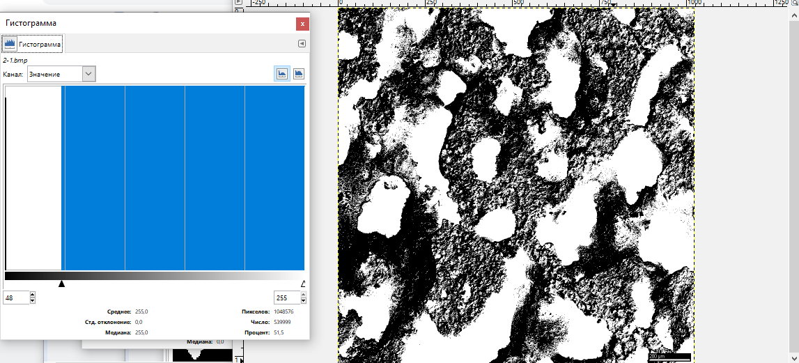 Рисунок 20 Выделяем на гистограмме область слева, чтобы получить кол-во черных пикселей в процентах , параметр "Процентиль"