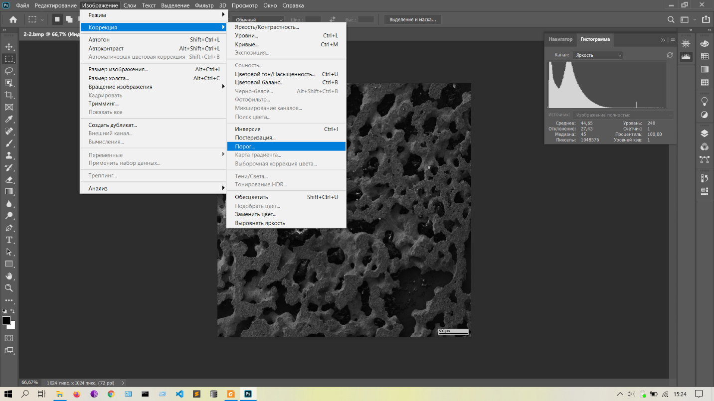 Рисунок 10 Выбираем опцию "порог" , идентичную "Threshold" в программе "UTHSCSA ImageTool"