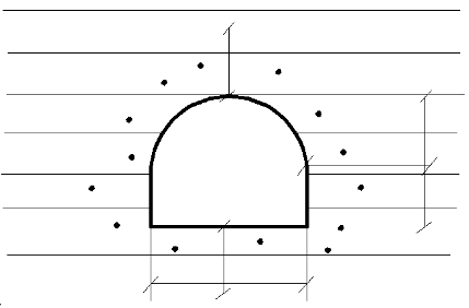 1,5 ширины выработки в проходке в кровле выработки, в боках выработки ширина