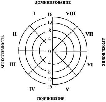 Она включает три методики для диагностики межличностных отношений у индивида на четырех уровнях. Результаты всех измерений переводятся в так называемую дискограмму - круг, который составляют из восьми психологических тенденций (октант). Они определенным образом ориентированы относительно двух главных осей в межличностных отношениях. По мнению Т. Лири, это доминирование - подчинение и дружелюбие - агрессивность. Октанты заключают в себе качества, характеризуемые следующими восемью психологическими тенденциями: 1) тенденция к лидерству - властность - деспотичность; 2) уверенность в себе - самоуверенность - самовлюбленность; 3) требовательность - непримиримость - жестокость; 4) скептицизм - упрямство - негативизм; 5) уступчивость - кротость - пассивная подчиняемость; 6) доверчивость - послушность - зависимость; 7) добросердечие - несамостоятельность - чрезмерный конформизм; 8) отзывчивость - бескорыстие - жертвенность.