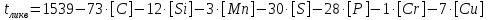 [C], [Si], [Mn], [S], [P], [Cr], [Ni], [Cu], [Al], [V], [Ti], [Mo], [Co], [W] –содержание в стали, соответственно, углерода, кремния, марганца, серы, фосфора, хрома, никеля, меди, алюминия, ванадия, титана, молибдена,