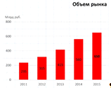 По данным Datainsight объем рынка электронной торговли в цифрах несколько другой: в 2015 году - 650 млрд.руб. (рис. 2.3) И соответственно рост за год (2014-2015гг.) составил 16%.